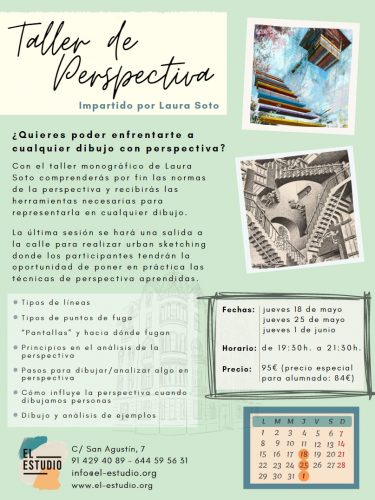 Consta de dos partes, en la primera abordaremos la perspectiva tradicional y en la segunda exploraremos otros modos más personales de construir el espacio: evolucionando desde la abstracción a la figuración, estructurando bloques de color, enfatizando ritmos, creando un recorrido visual a través de la línea, etc.